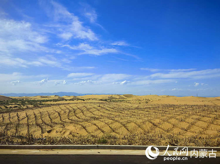 达拉特旗境内公路旁“流动”的草方格。人民网记者 苗阳摄