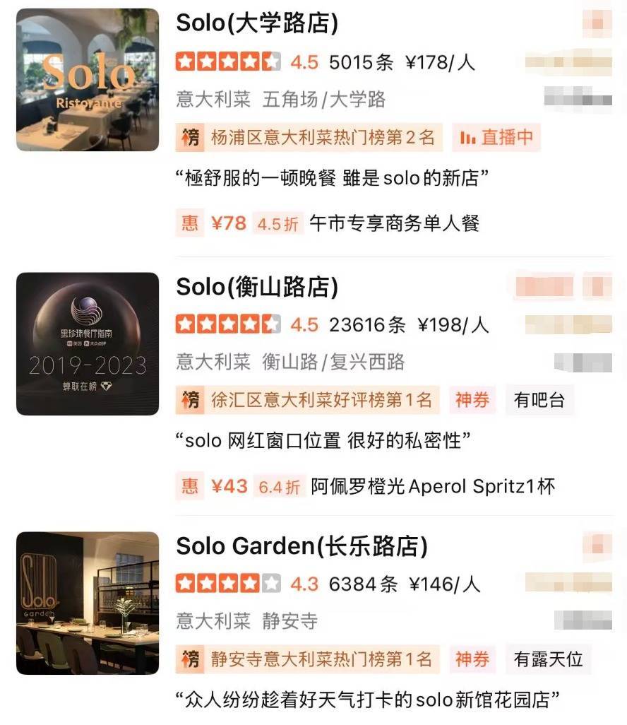 据悉,solo衡山路店是2019-2023年蝉联在榜的黑珍珠餐厅,人均200元左右,solo品牌目前在上海有3家门店。