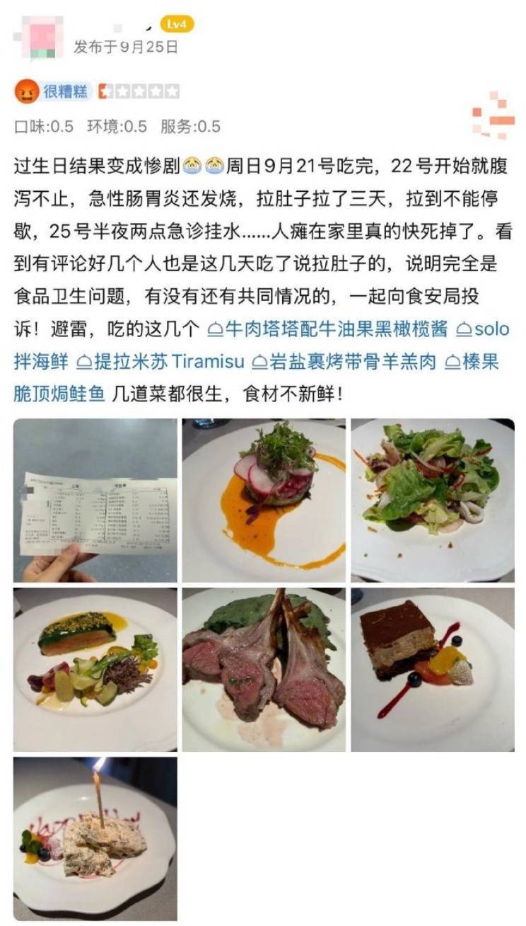 9月28日,“Solo”餐厅相关工作人员就此事回应,目前已与反馈不适的顾客取得联系,正处于协商沟通阶段。“我们今天已经向食药监部门提交了相关证明材料,包括餐厅的食品安全许可证、食材供货商信息,以及顾客提供的医疗就诊单据等。” 该工作人员强调,食品安全是餐厅始终坚守的底线,目前也已启动内部盘查。